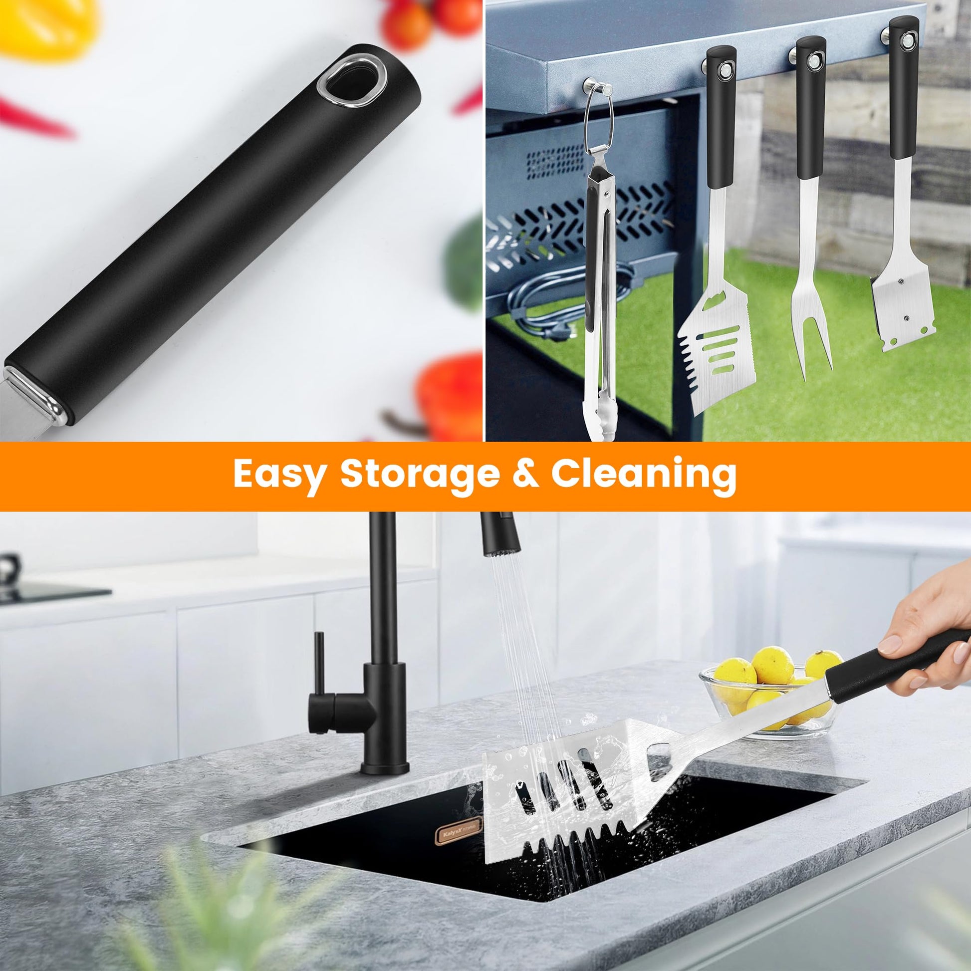 - Easy Cleaning & Storage: Each long-handle BBQ tool has a hanging loop for convenient storage. This grill tool set can be easily cleaned with dish soap. The grill tong, skewers, and silicone corn holders are dishwasher-safe.